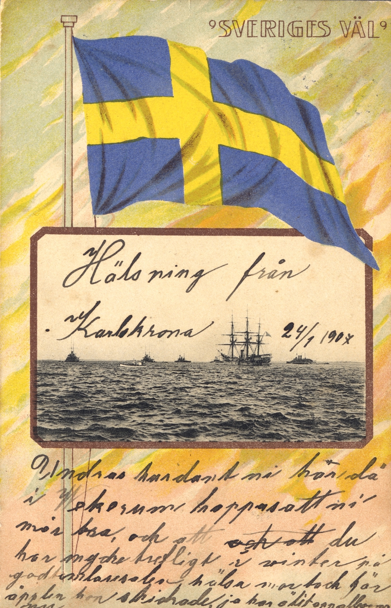 Vykort med ett seglande fartyg och Svenska flaggan med orden " Sveriges Väl".