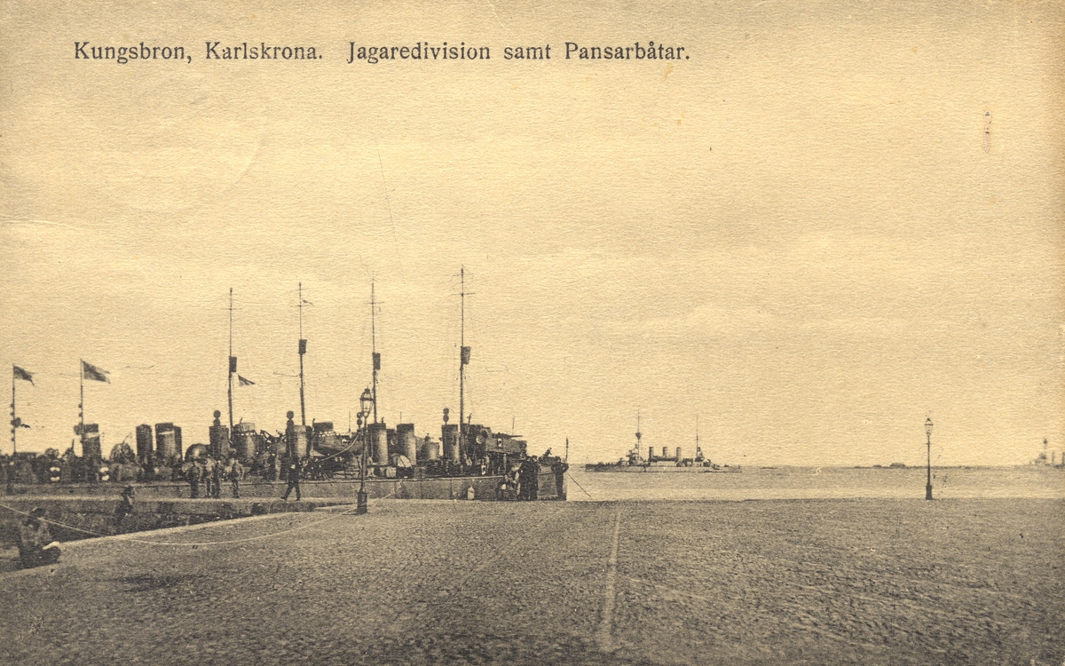 Vykort från kungsbron i Karlskrona med jagaredivisionen och Pansarbåtar