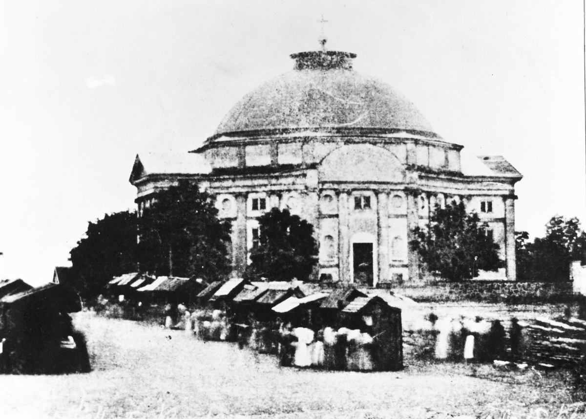 Tyska kyrkan med stortorgets salubodar omkring åren 1850-60