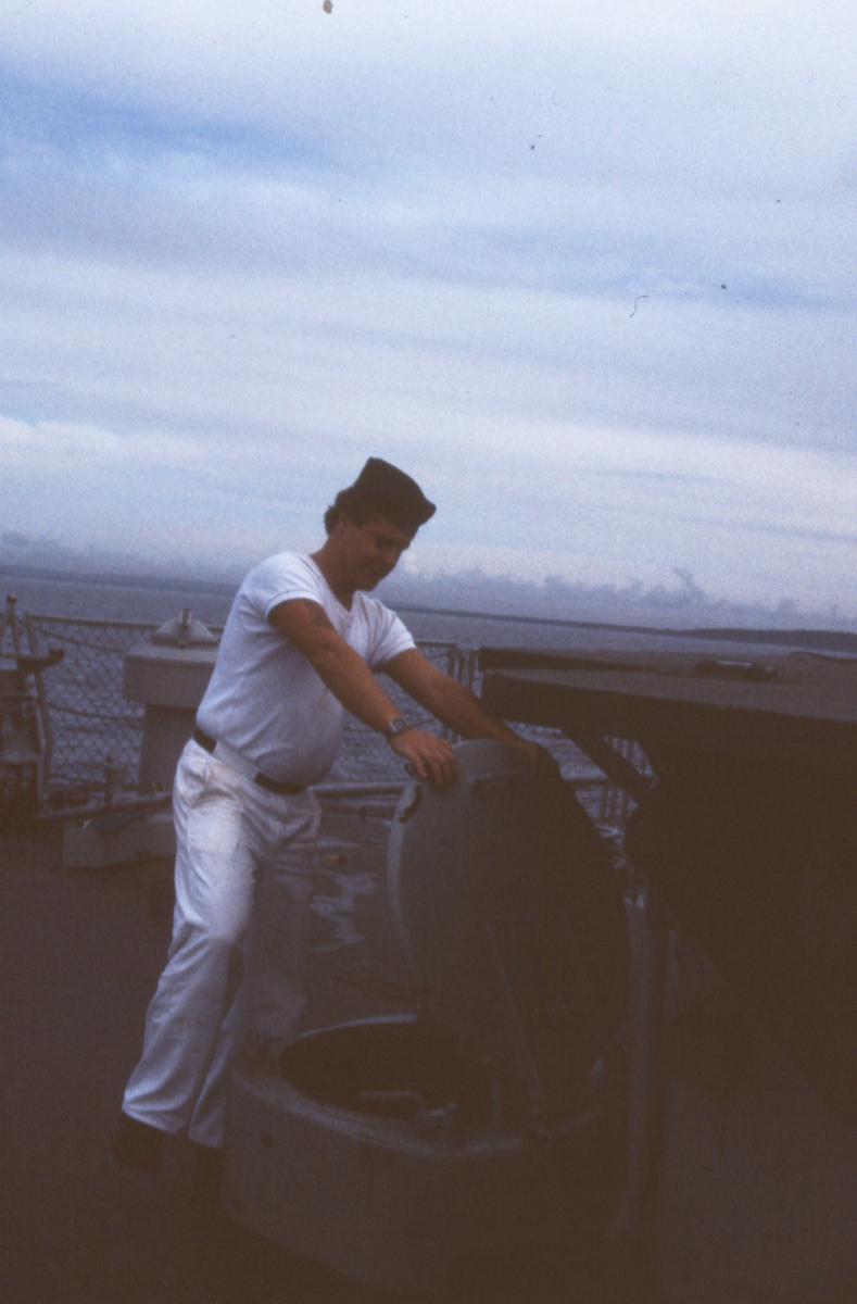 Sista krigsförbands övningen på Jagaren Hallands långresa 1982 bilden: Man vid nedstigningslucka ombord på Jagaren Halland