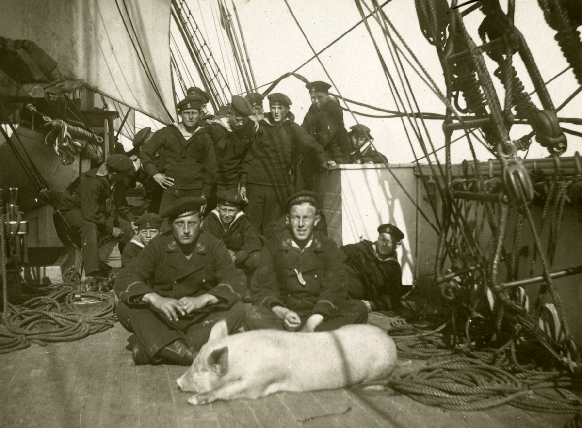 Sjömän, skeppsgossar och en gris i en gruppbild ombord segelfartyget GLADAN. Längst fram till vänster Gustaf Andersson.