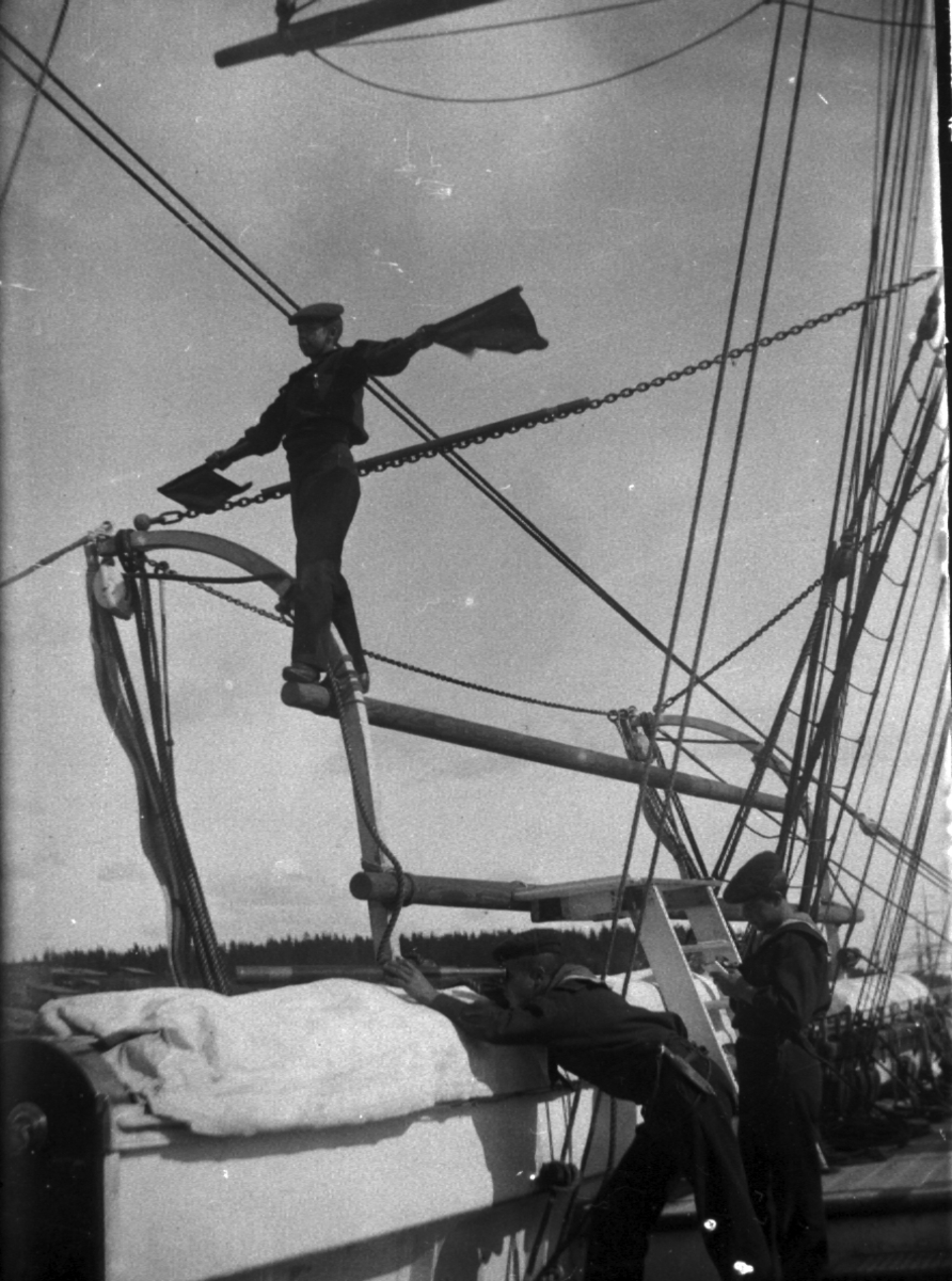 Skeppsgosse ombord på Jarramas signalerar med flaggor.