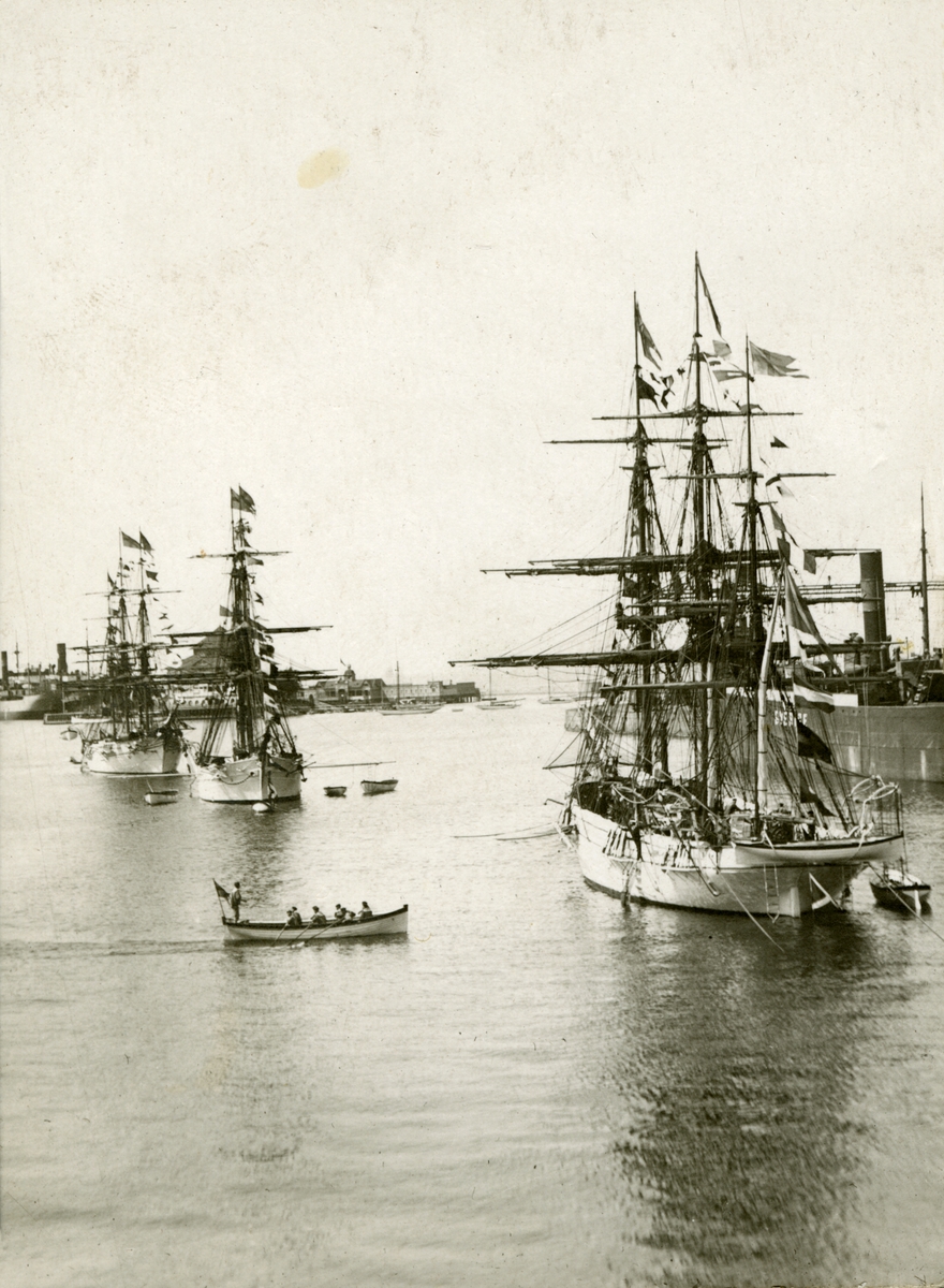 Sannolikt är det segelfartyget NAJADEN längst fram till höger och JARRAMAS längst bak till vänster. Oklart vilket fartyg som är i mitten men det kan vara FALKEN eller GLADAN. Runt omkring finns några båtar av olika slag.