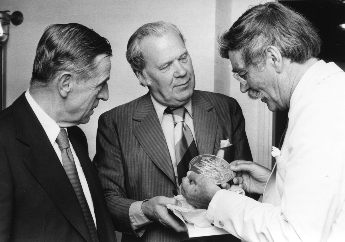 Bredo v Munthe af Morgenstierna emottar den tredje kända exemplaret av den stora kögermedljen som deposition från Aarhus museum överlämnat av dess museichef.