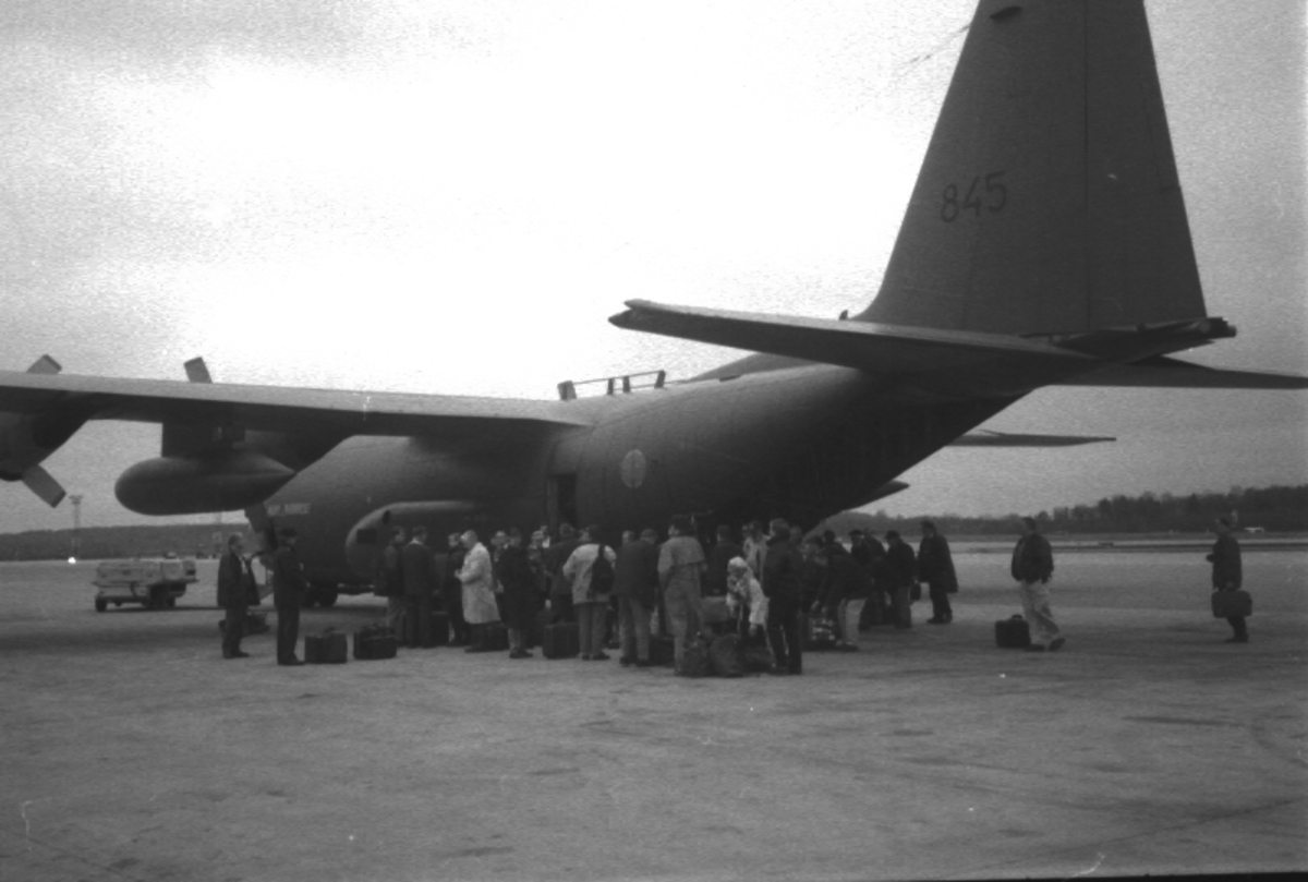 Det svenska flygvapnets transportplan Herkules, som i mars 1998, tranporterar deltagarna i SFHM kurs för förbandsföreståndare m fl från Visby till Arlanda.
