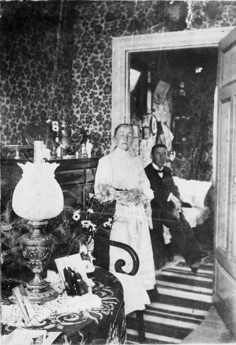 Fru Dorothea Lindström 1852-1927 och sonen Edvin Lindström i finrummet Fregattgatan 13A Björkholmen Karlskrona