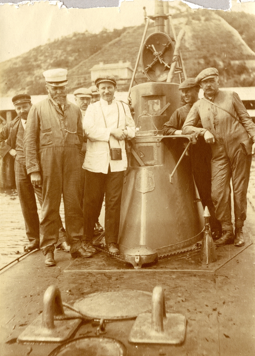 Gruppbild på varvspersonalen ombord ubåten HVALEN. Sett från fören.