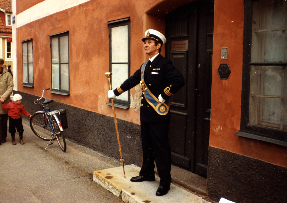 flaggtrumslagaren Alf Sigurdsson, stoltsera här utanför ingången till gamla Blekinge Museum f.d Amiral Carl Reinhold Nordenskiölds gård.
