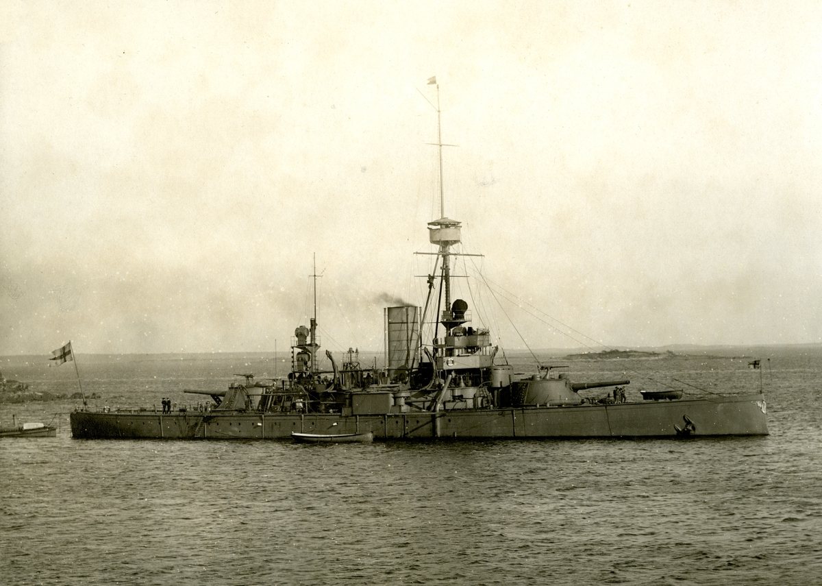 Fartygsporträtt av Pansarskeppet ODEN efter ombyggnad 1915 på Karlskrona redd. De två skorstenarna har ersatts av en.