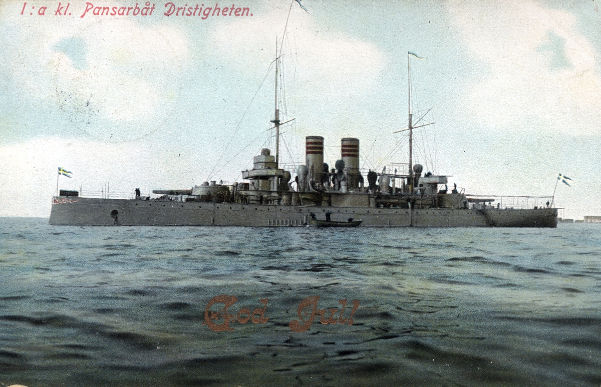 Vykort på pansarbåten Dristigheten. på vykortet står med röd text God Jul!