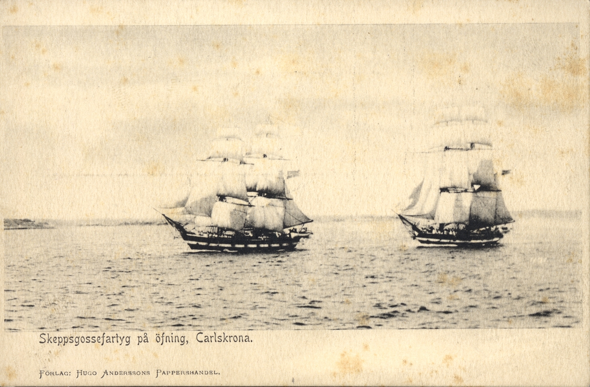 Skeppsgossebriggarna Skirner och Snappopp på vardera 80 ton, besättningen utgjordes av 55 män här för fulla segel och med vita relingar året är 1896.