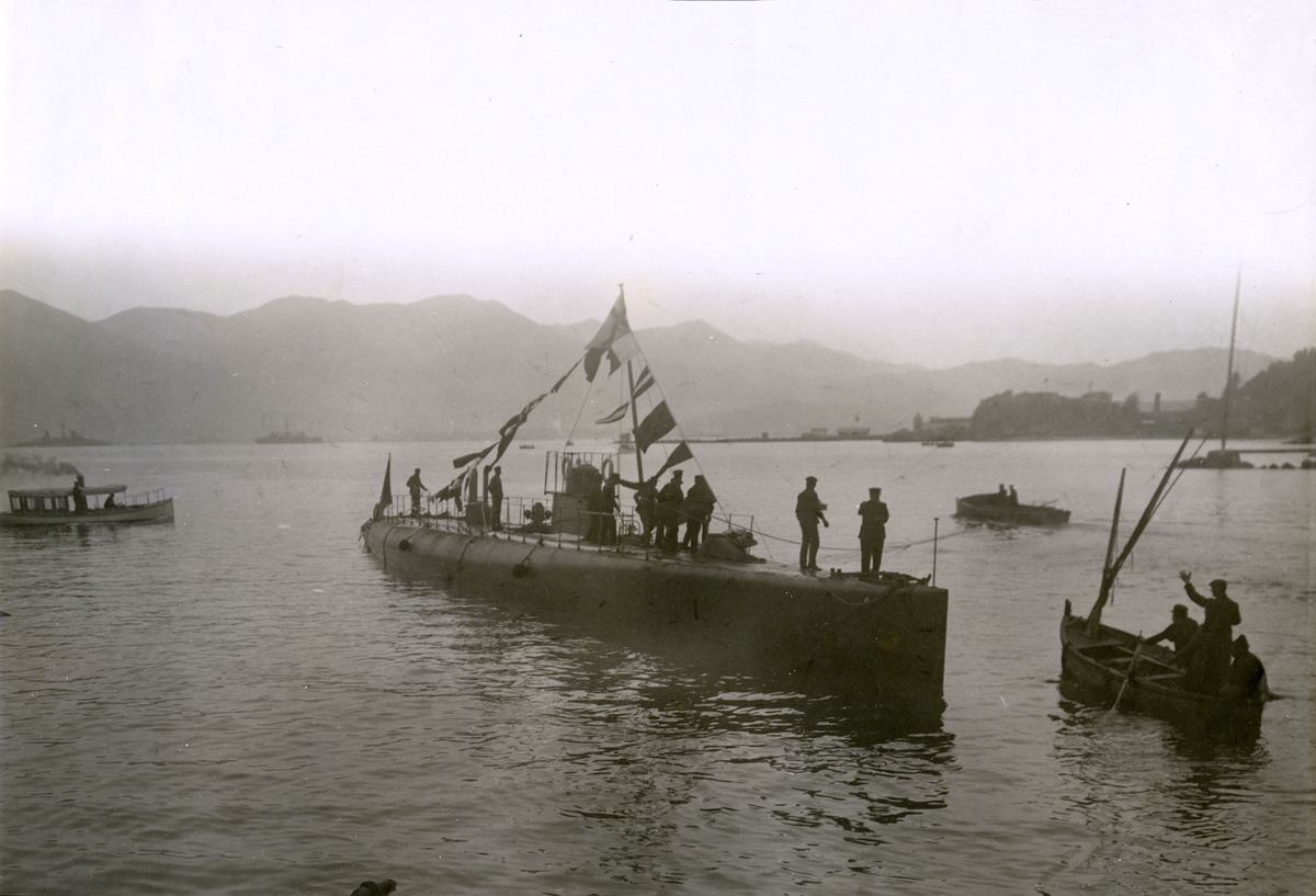 Ubåten HVALEN efter stapelavlöpning (sjösättning av nybyggt fartyg från stapelbädd).