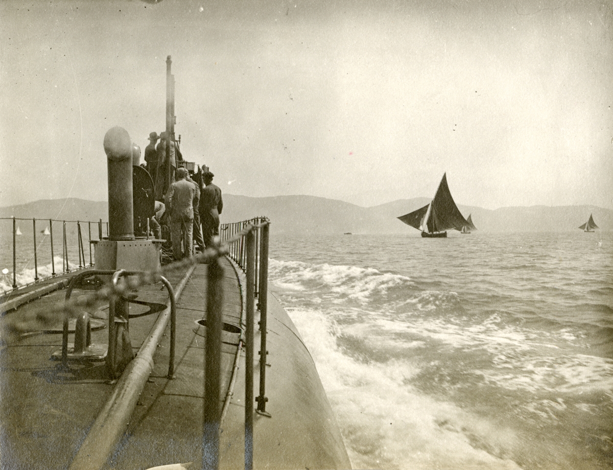 Personal från varvet Fiat-San Giorgio i Spezia tar en provtur med Ubåten HVALEN.