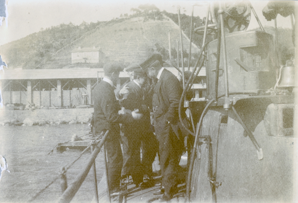 Gruppbild på varvspersonalen vid ubåten HVALENs torn. Varvet Fiat-San Giorgio i bakgrunden. Fotograferat från aktern.