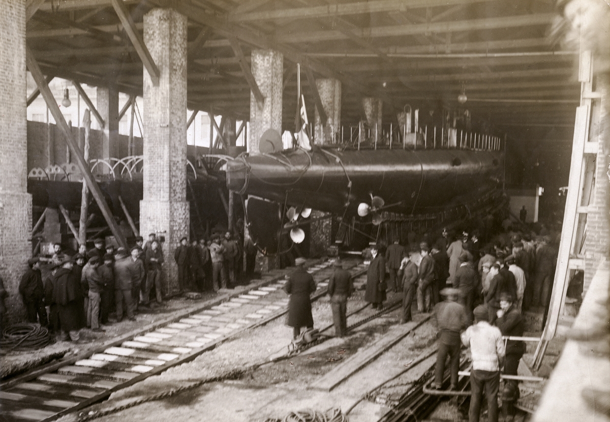 Till vänster syns ubåten FOCA som byggs till den italienska flottan.