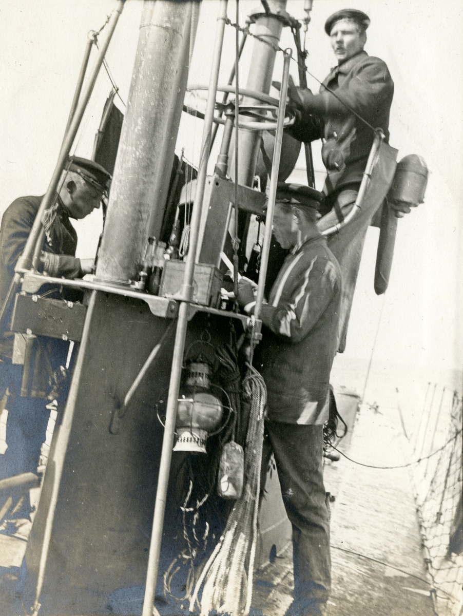 Tornet med tre av ubåten HVALENs besättningsmän sett från aktern.