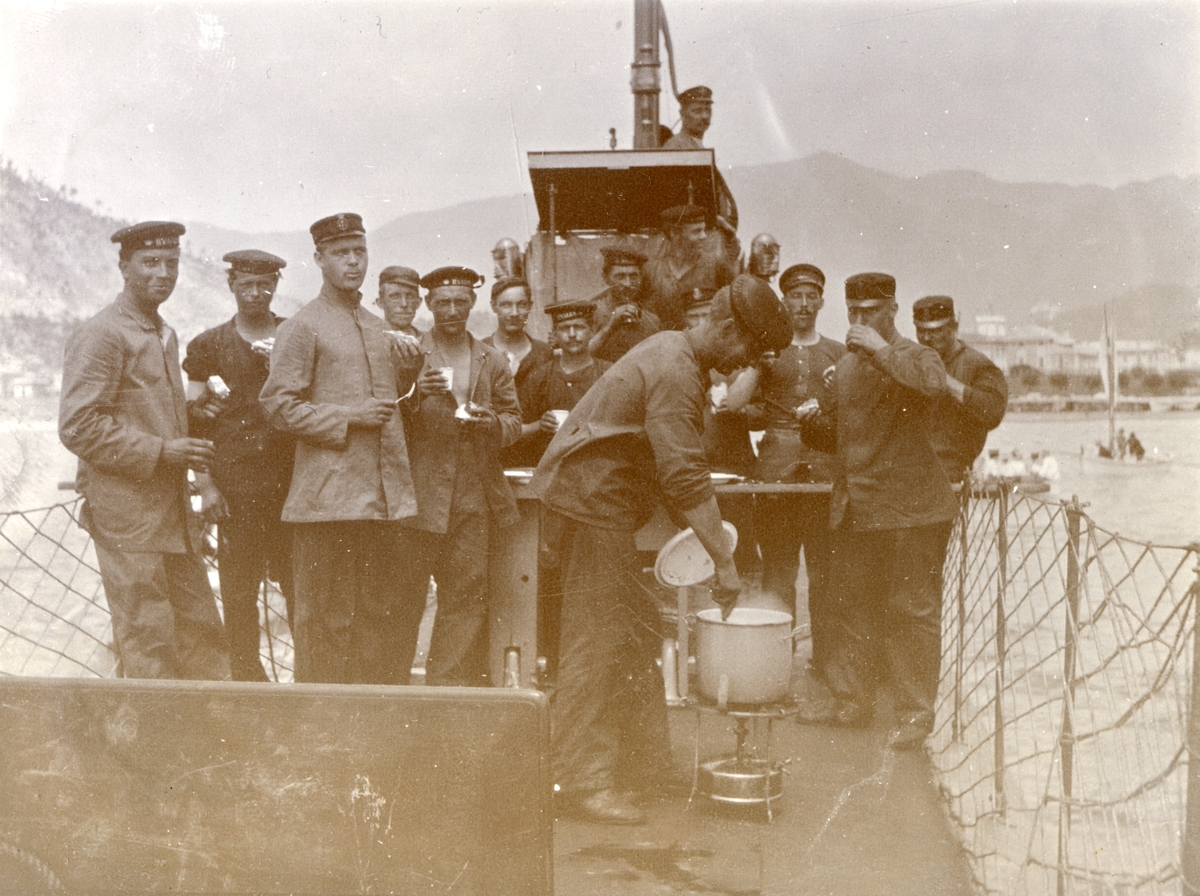 Allemans skaffning ombord ubåten HVALEN. I bakgrunden ses staden Spezia.