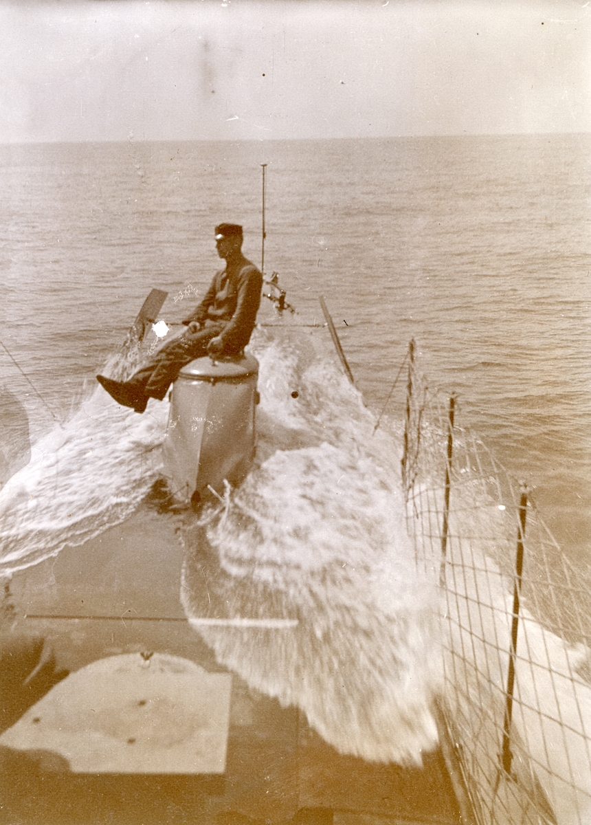 En man sitter på förliga manluckan vid överspolning till sjöss. Ubåten HVALEN.