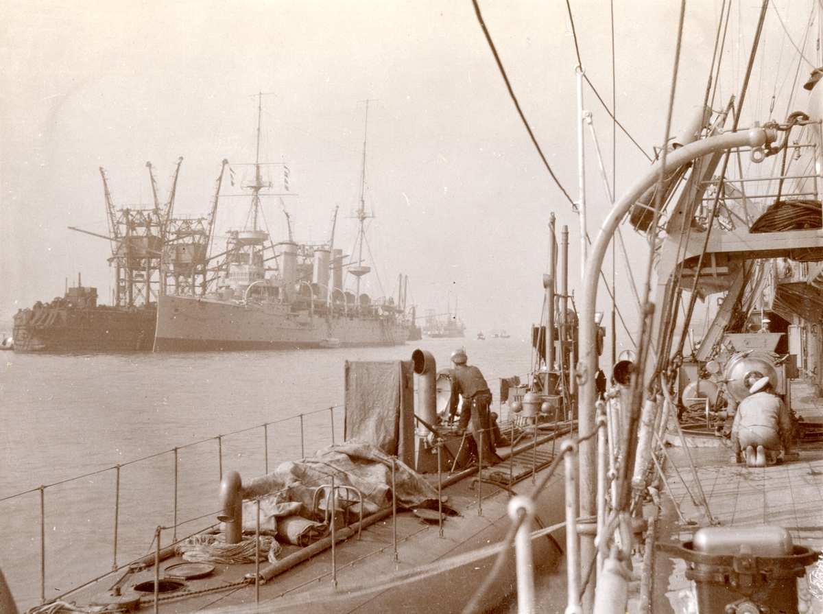 Till vänster i bilden ser vi Temperley Patent förankarad i Portsmouth hamn, med en brittisk kryssare av Eclipse klassen förtöjd längs sidan. Ubåten Hvalen låg i Portsmouth mellan den 9-19 september 1909.