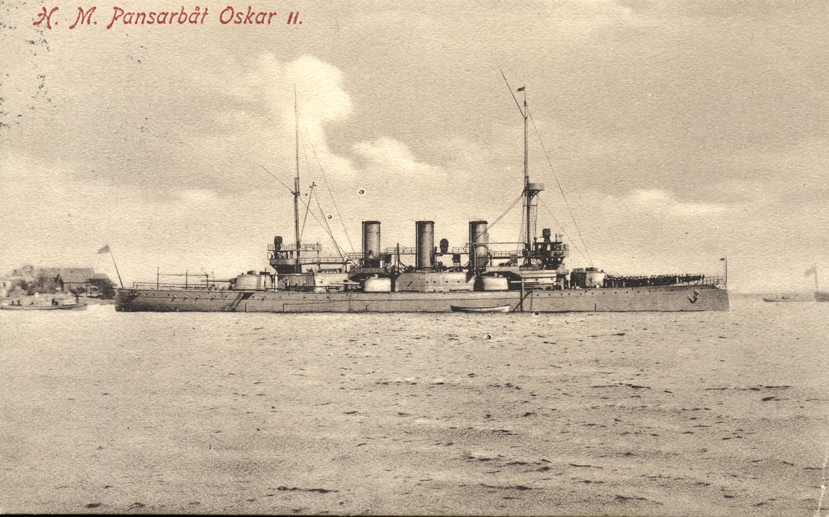 Vykort på H M pansarbåten Oskar II. färdigbyggd 1907, 4270 ton, längd 95,6 m. 18,3 knop, 2 st 21 cm. 8 st. 15 cm. och 10 st. 5,7 cm. kanoner. 2 undervattens 45 cm torpedtuber. vattenlinjepansar 150 mm.