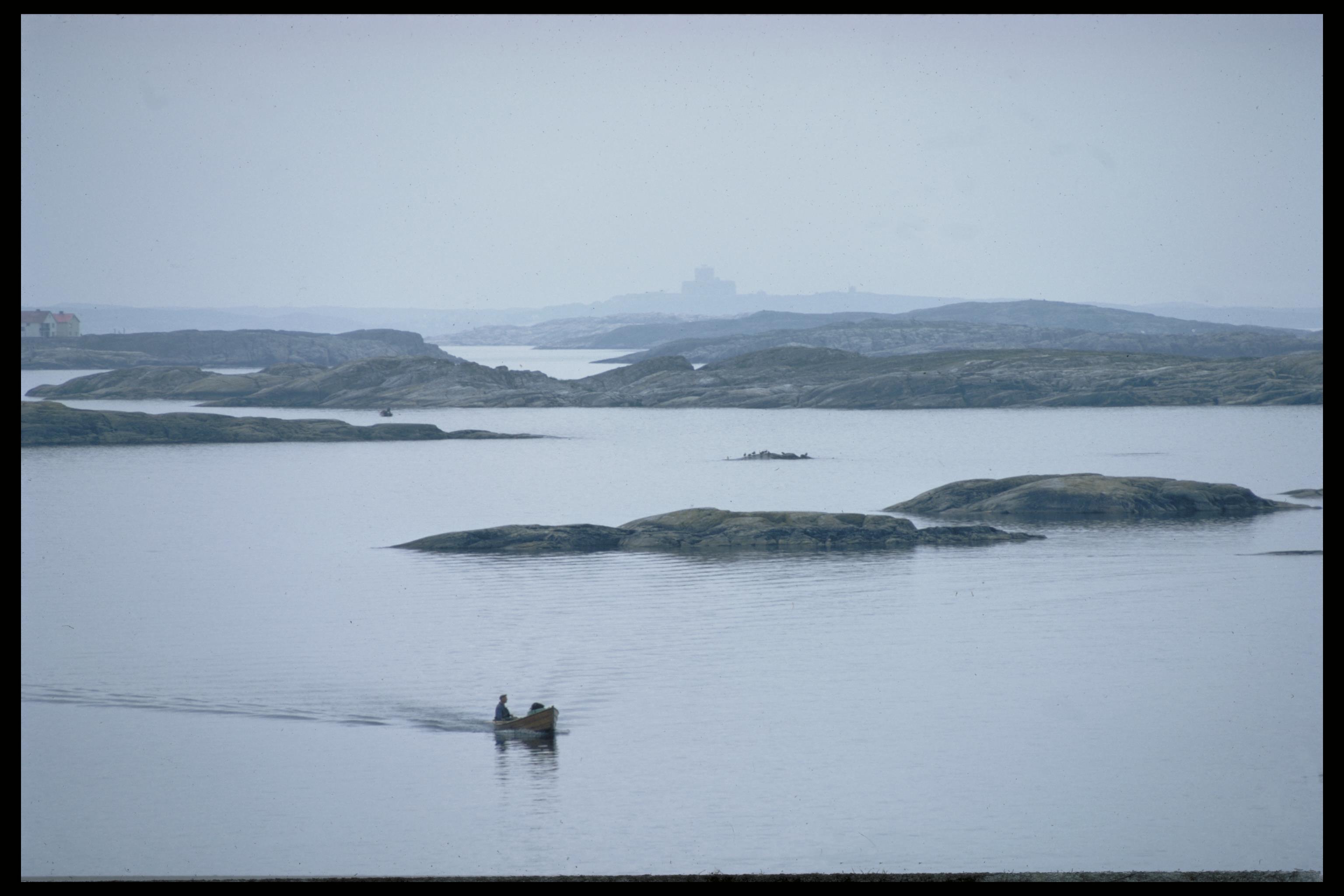Båt i Bohusläns skärgård. I bakgrunden syns Carlstens fästning i Marstrand. Bilden troligen från mitten av 1960-talet.