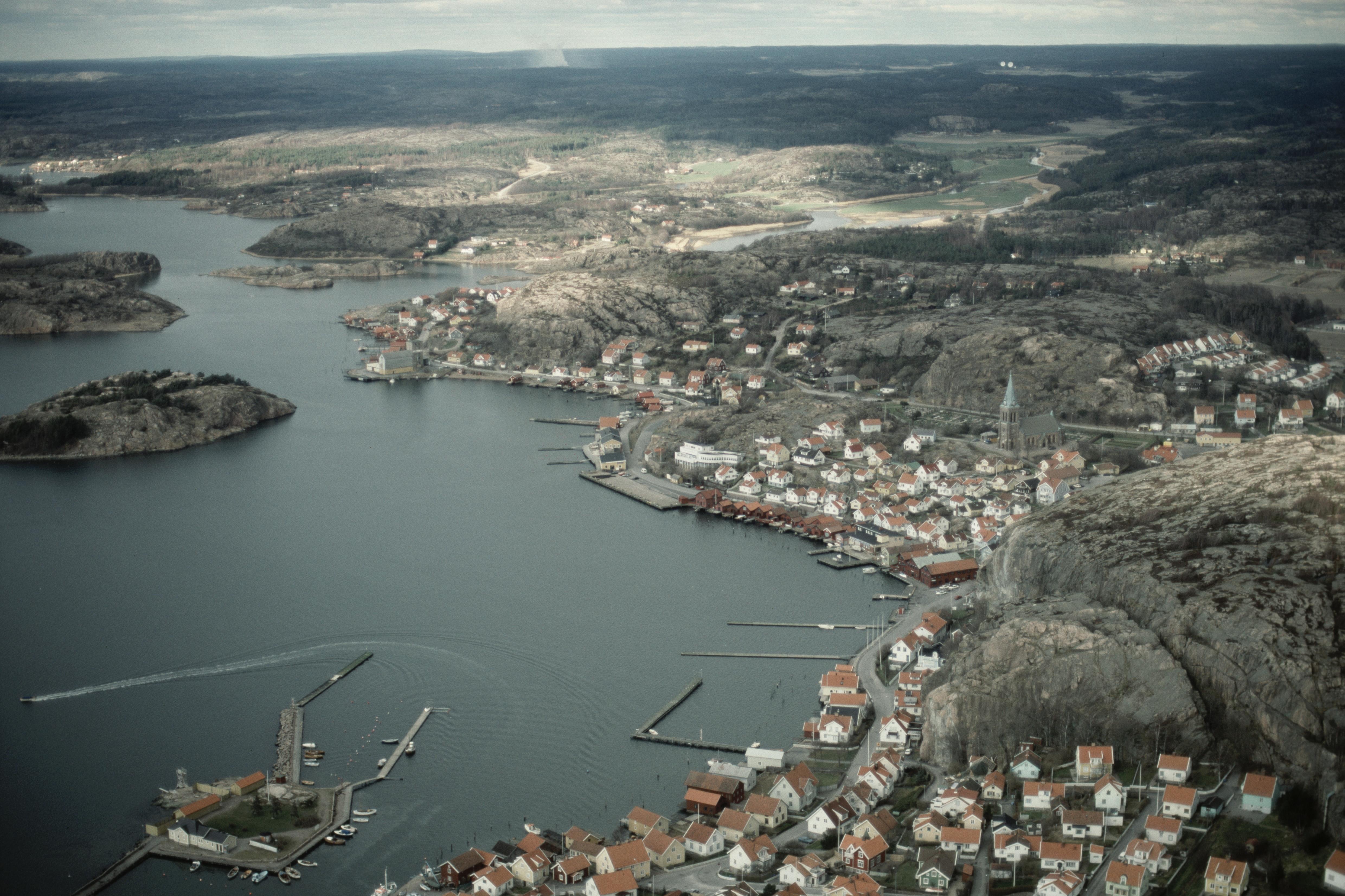 Fjällbacka tätort. Fjällbacka kyrka till höger om bildens mitt. Bilden är tagen mot (väderstreck): NNO