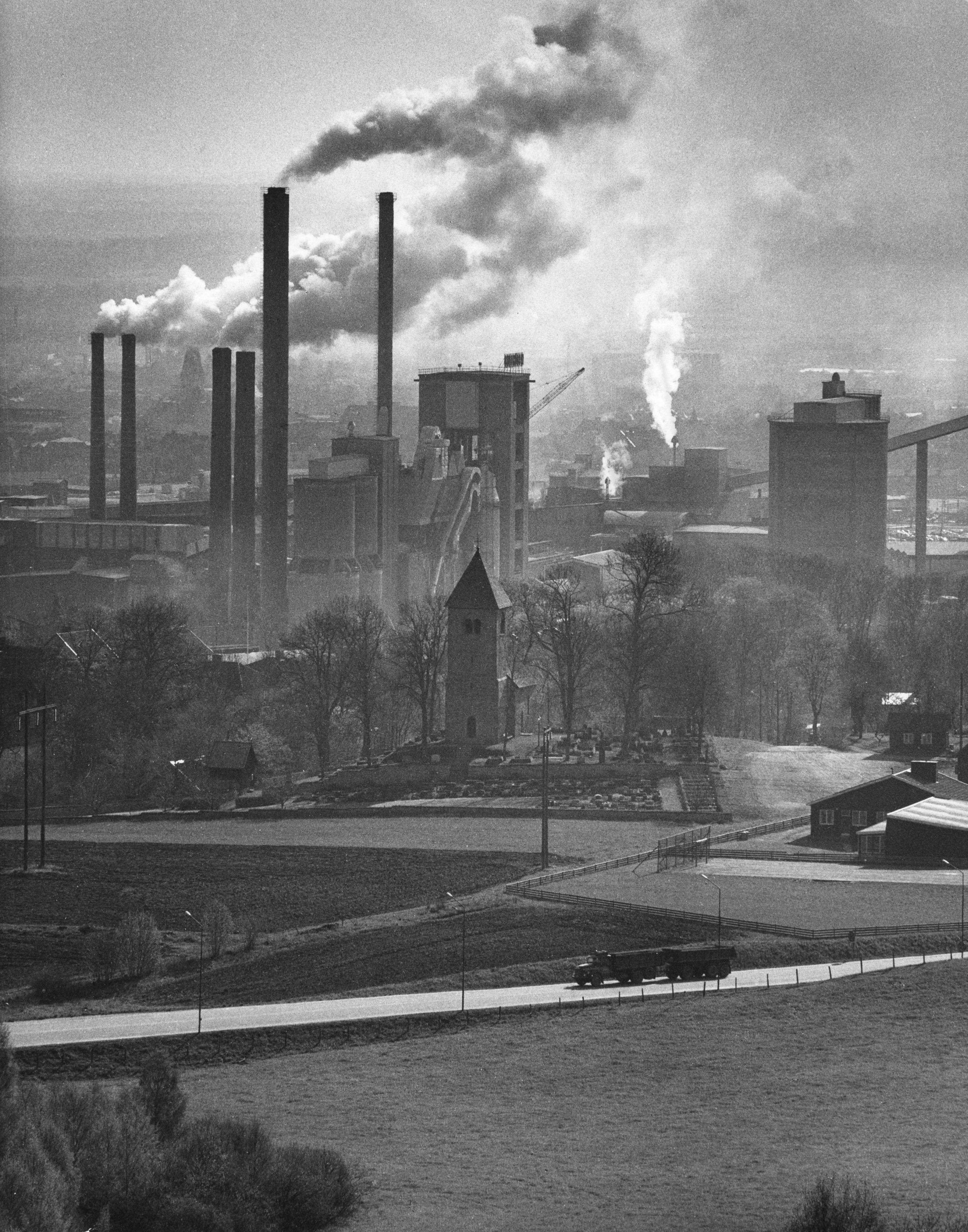Cementfabrik, Våmb kyrka i bildens mitt. Bilden troligen från slutet av 1960-talet.