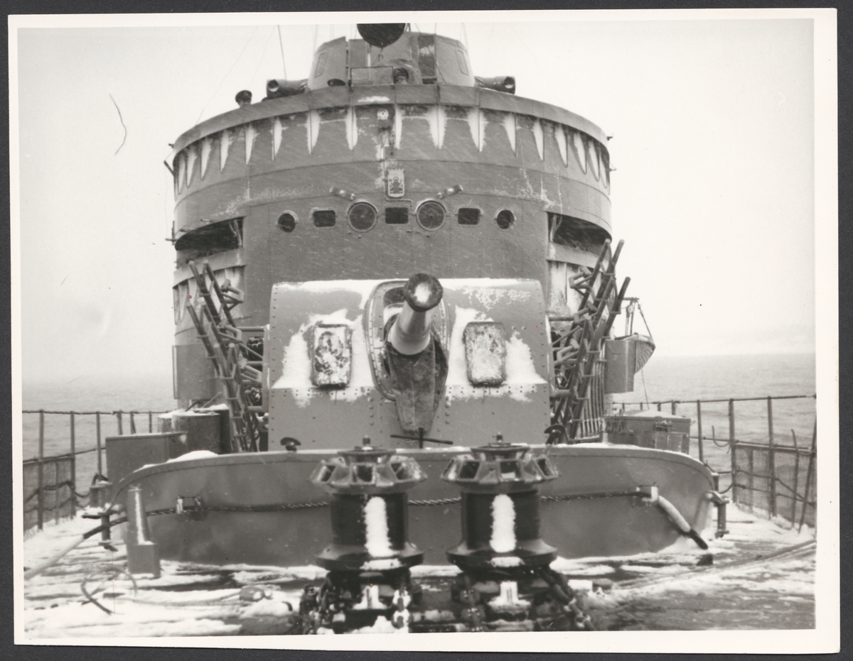 Titel: Bryggan av minsveparen Holmön i vinterväder
