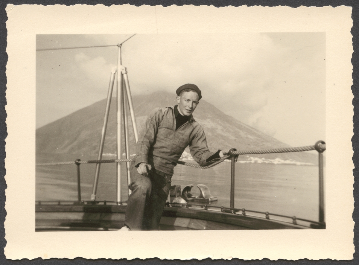 I arbetsuniform med Stromboli, en vulkan i bakgrunden