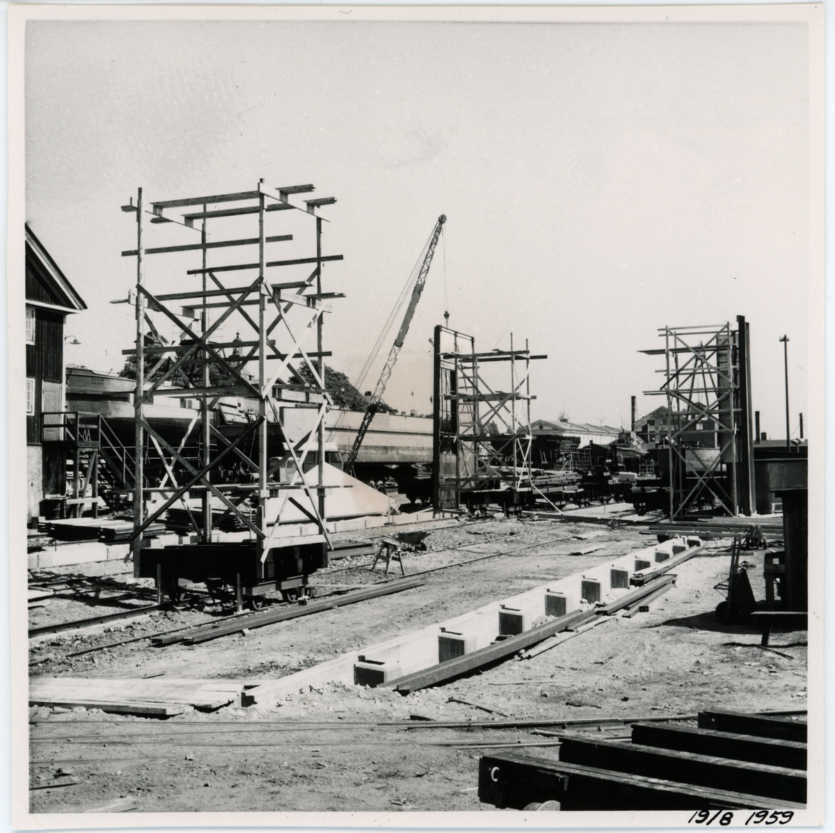 Verkstad för träfartyg, grundbalk och plintar för balkstomme