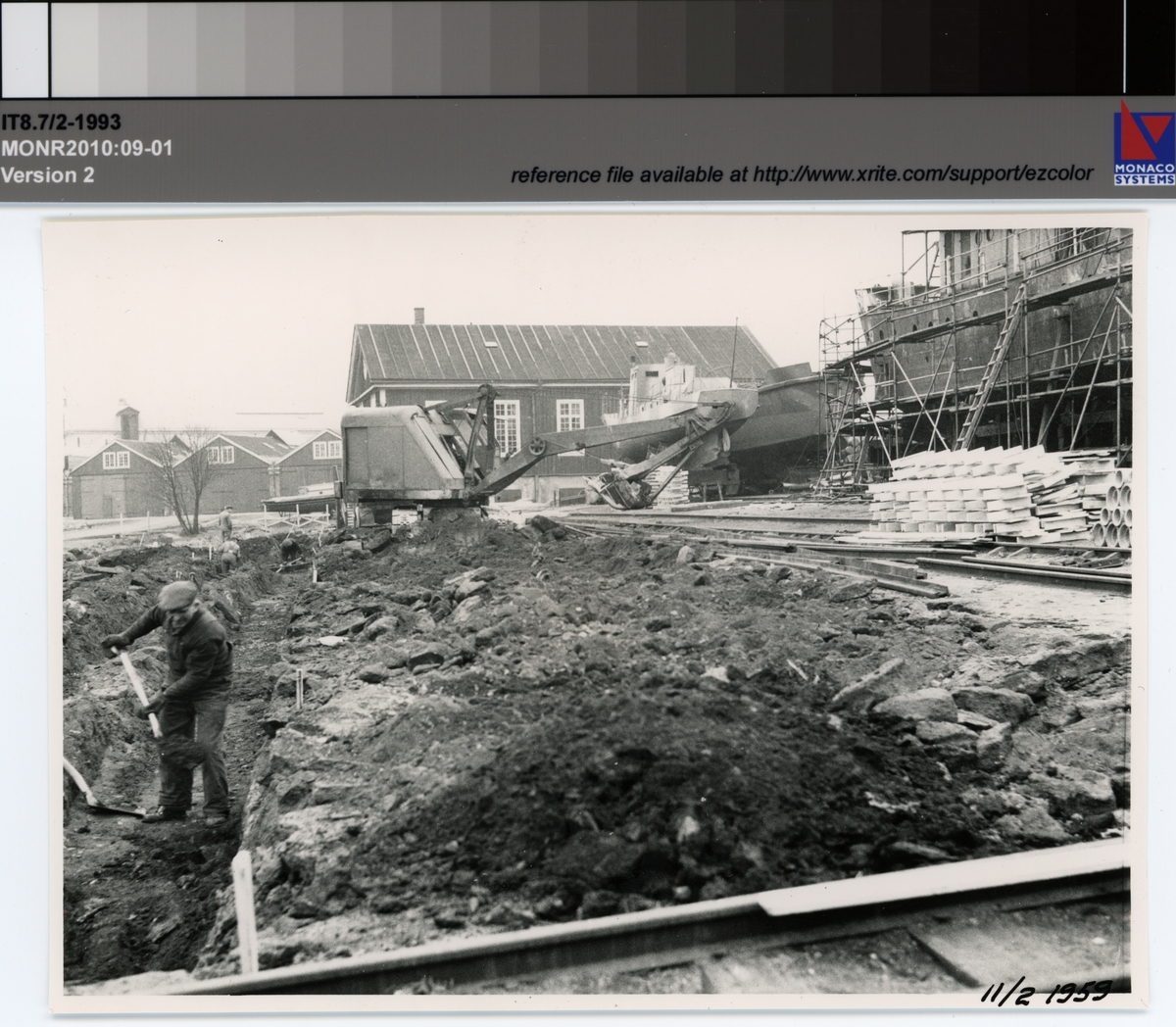 Torpedbåtslipen, förstärkning av spårbädd, schaktningsarbete, vy från sjöspåret västerut