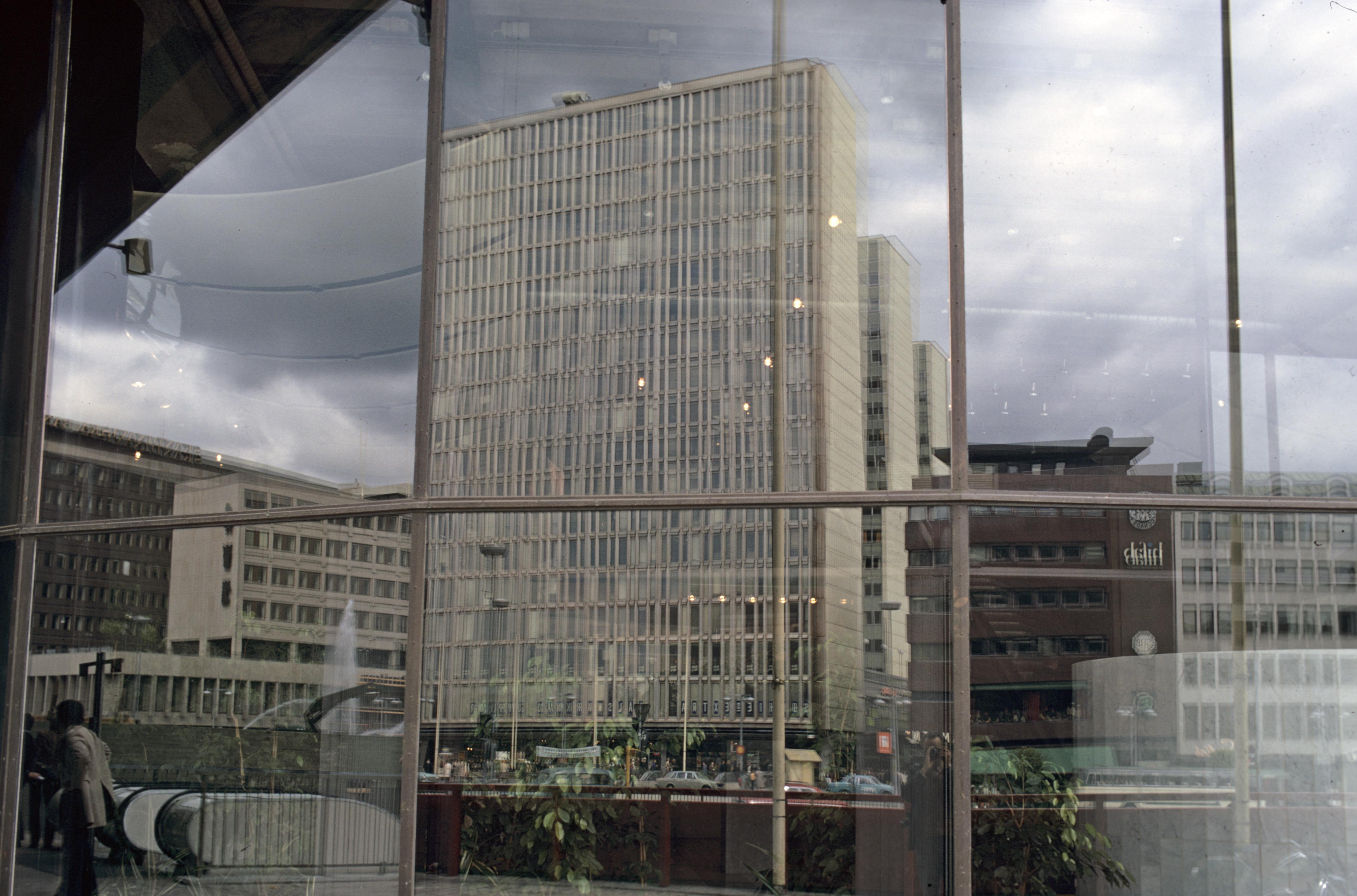 Husfasader återspeglade i fönster. Bilden troligen från början av 1970-talet.