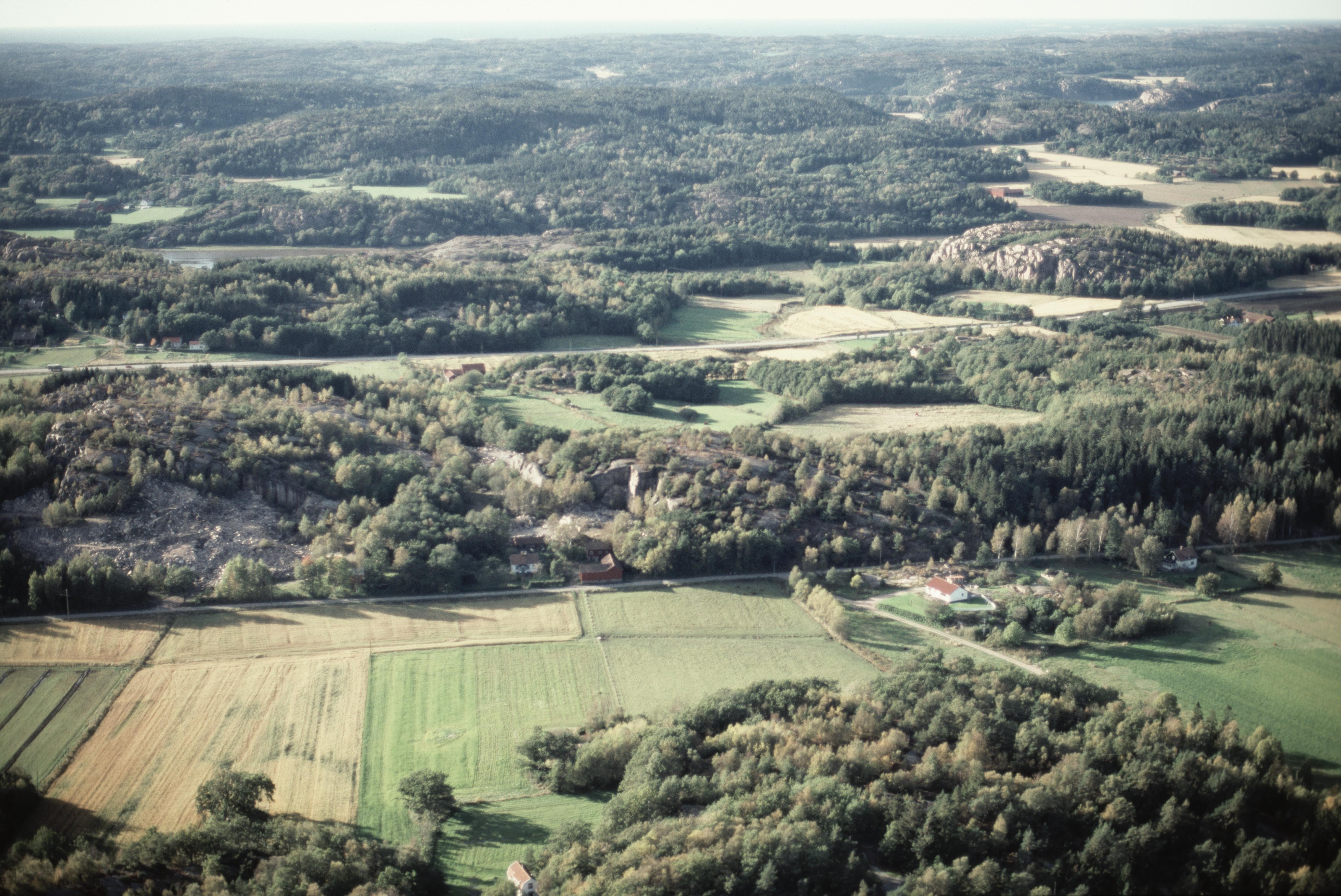 Stora Backa. Fornlämningsområde med bl.a. boplats RAÄnr Brastad 415:1 och stensättning Brastad 31:1 vid bildens mitt. Bilden är tagen mot (väderstreck): V