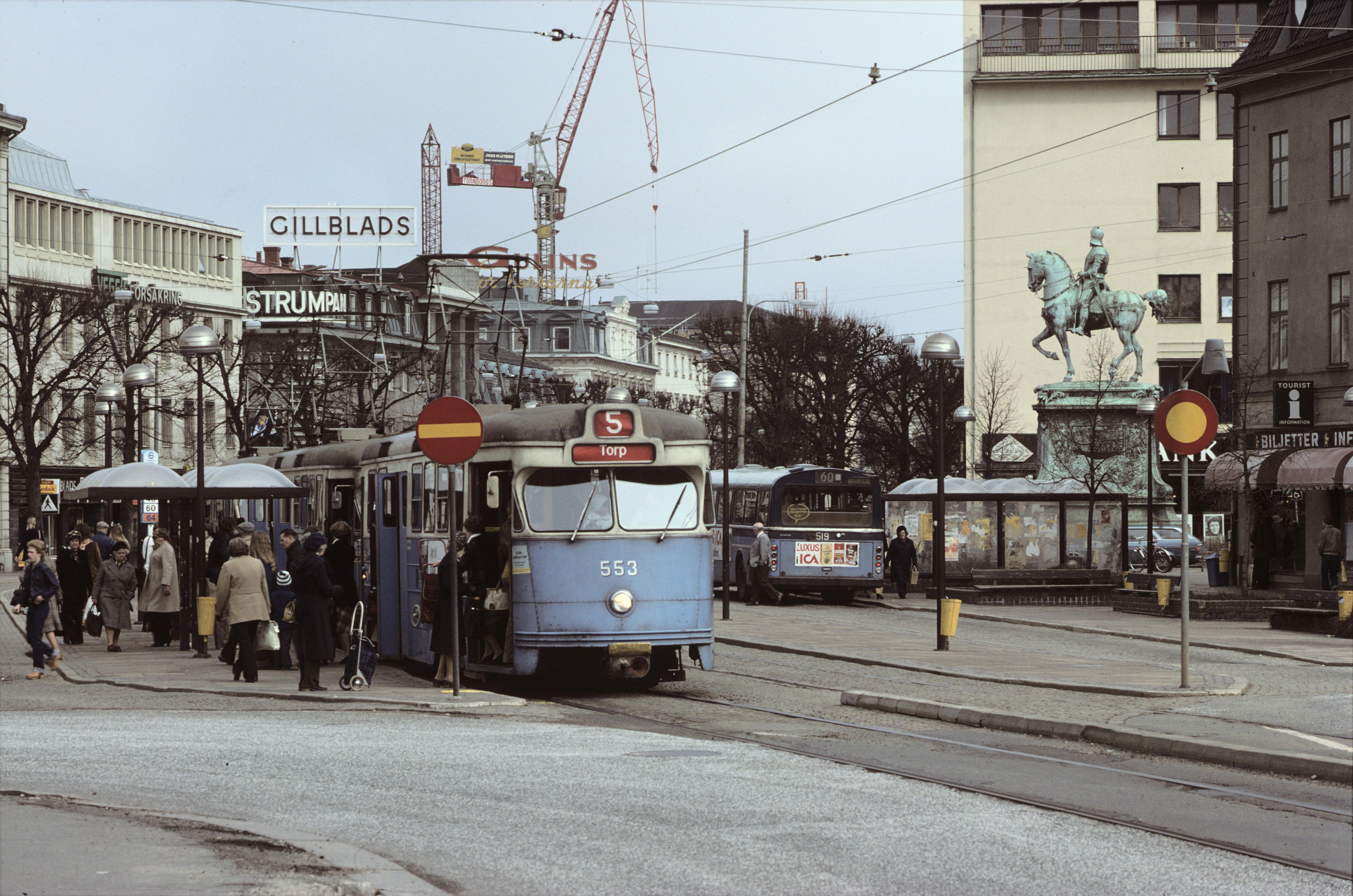 Spårvagnstrafik. T.h. syns Karl IX:s ryttarstaty av John Börjeson.