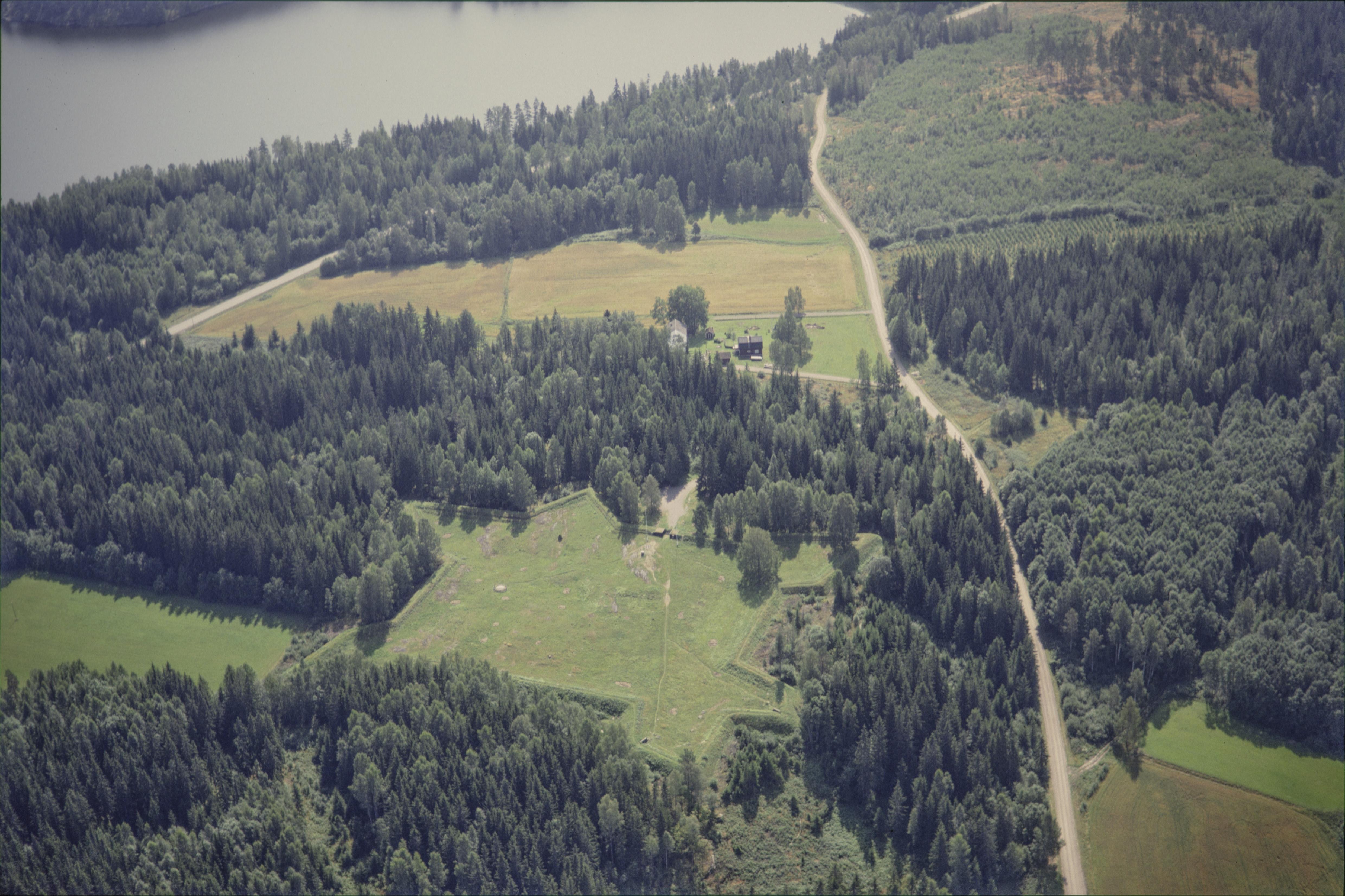 Eda skansar (fyra skansar vid Hagaviken i Bysjön i södra delen av Eda tätort). Skans RAÄnr Eda 15:1 vid bildens mitt. Bilden är tagen mot (väderstreck): SSO