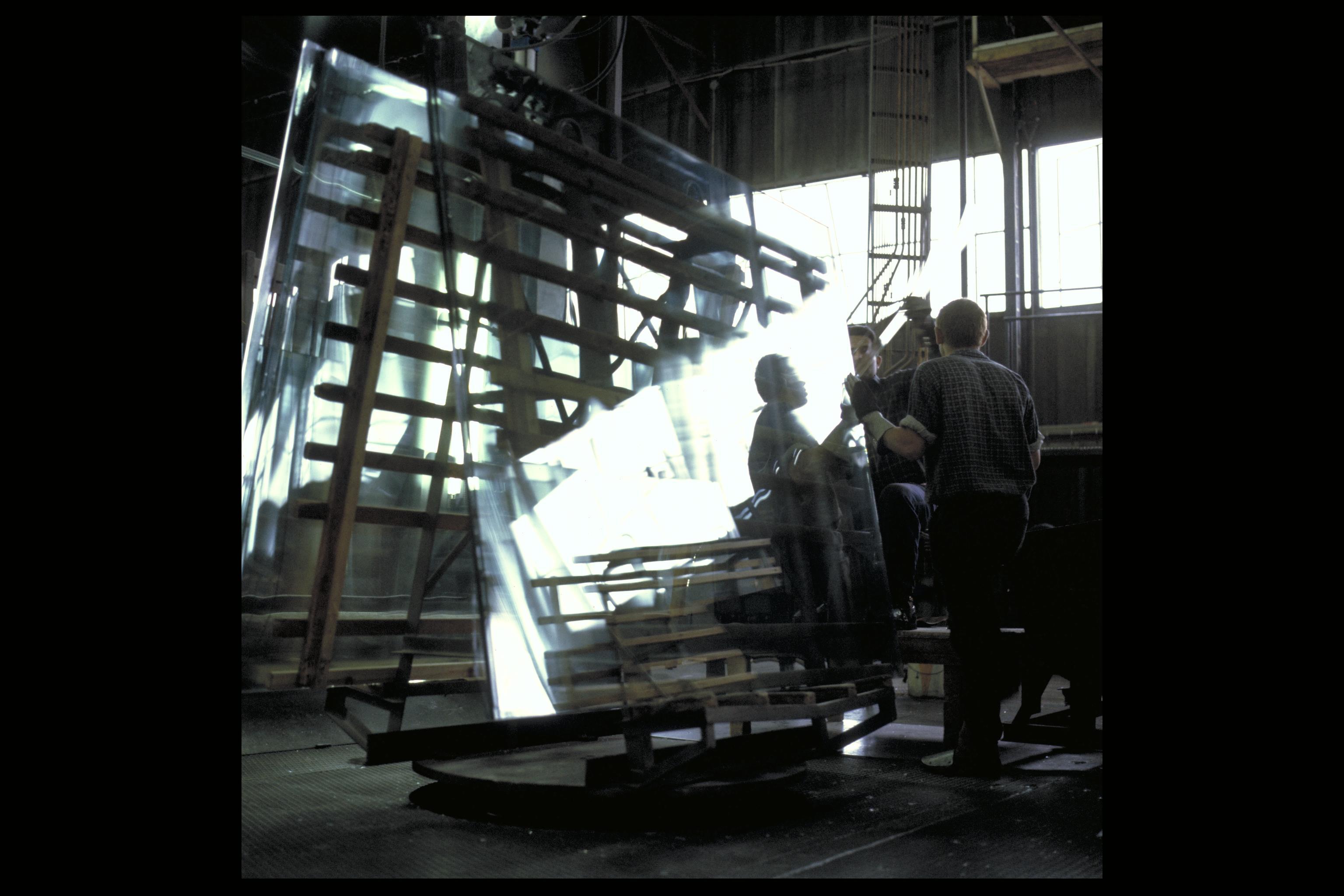 Tillverkning av fönsterglas. Bilden troligen från slutet av 1960-talet.