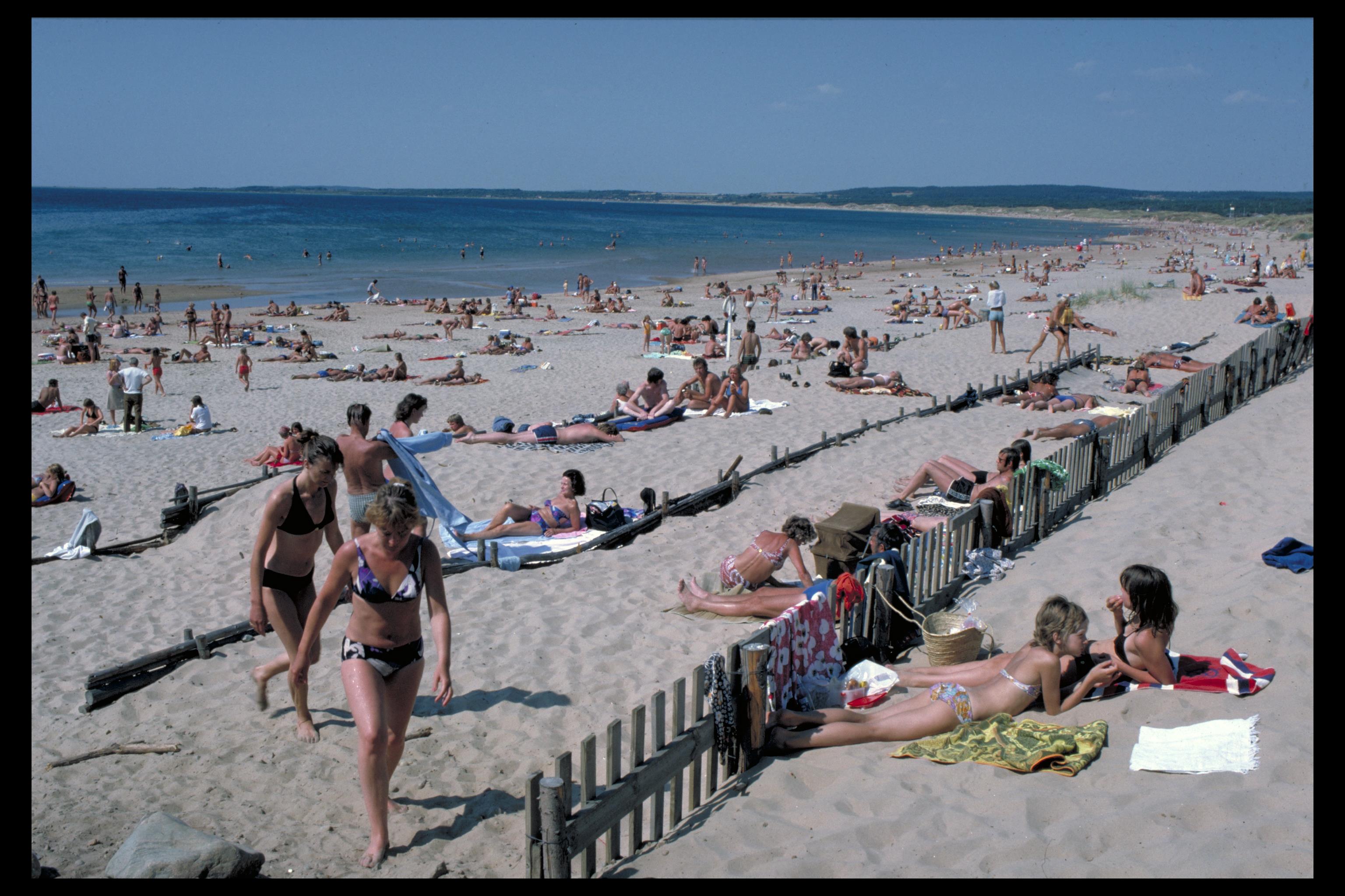Solande människor på stranden. Bilden troligen från mitten av 1970-talet.