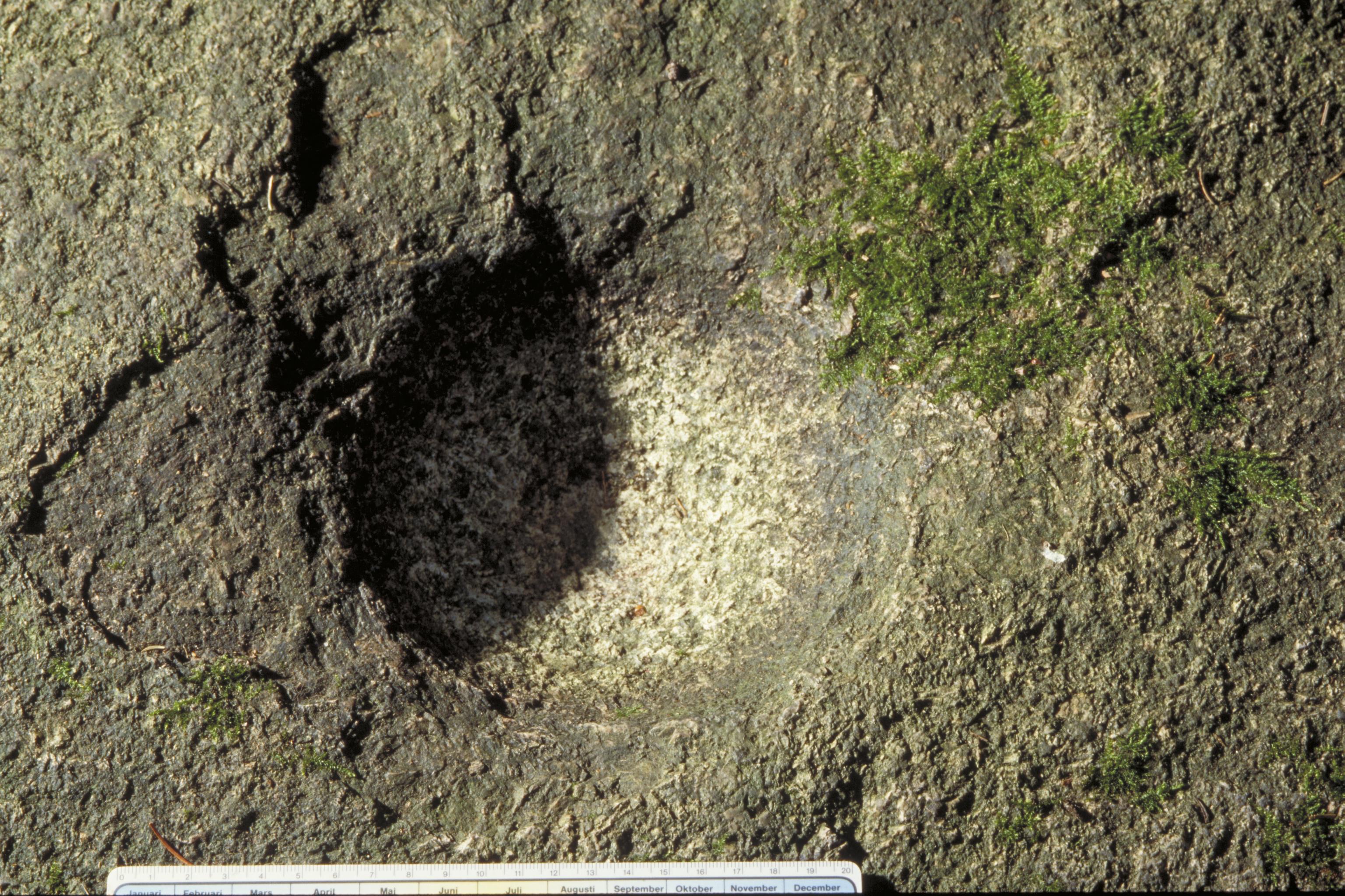 Skålgrop / älvkvarn med exfolieringsskador till vänster. Tossene 19:1.