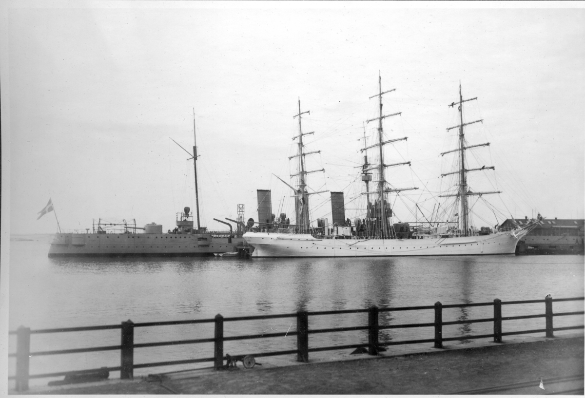 Övningsfartyget af Chapman och pansarkryssaren Fylgia liggande i laget.