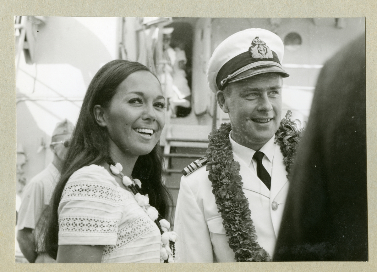 Bilden föreställer en kvinna och en besättningsman i vit uniform. Runt halsen är de utsmyckade med halsband. Bilden är tagen under minfartyget Älvsnabbens långresa 1966-1967.