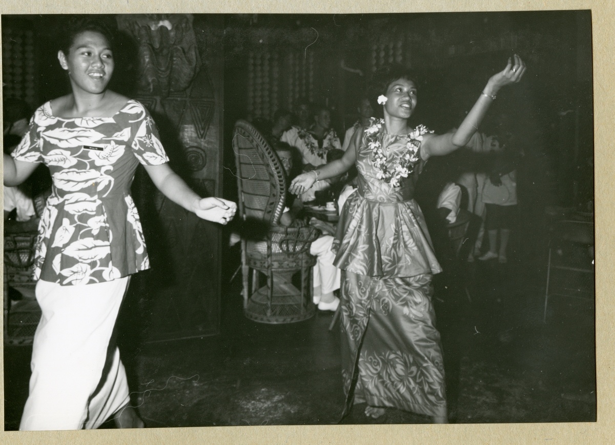 Bilden föreställer två kvinnor som framför en dans. I bakgrunden syns uniformsklädda män som åskådare. Bilden är tagen i Samoa i samband med minfartyget Älvsnabbens långresa 1966-1967.