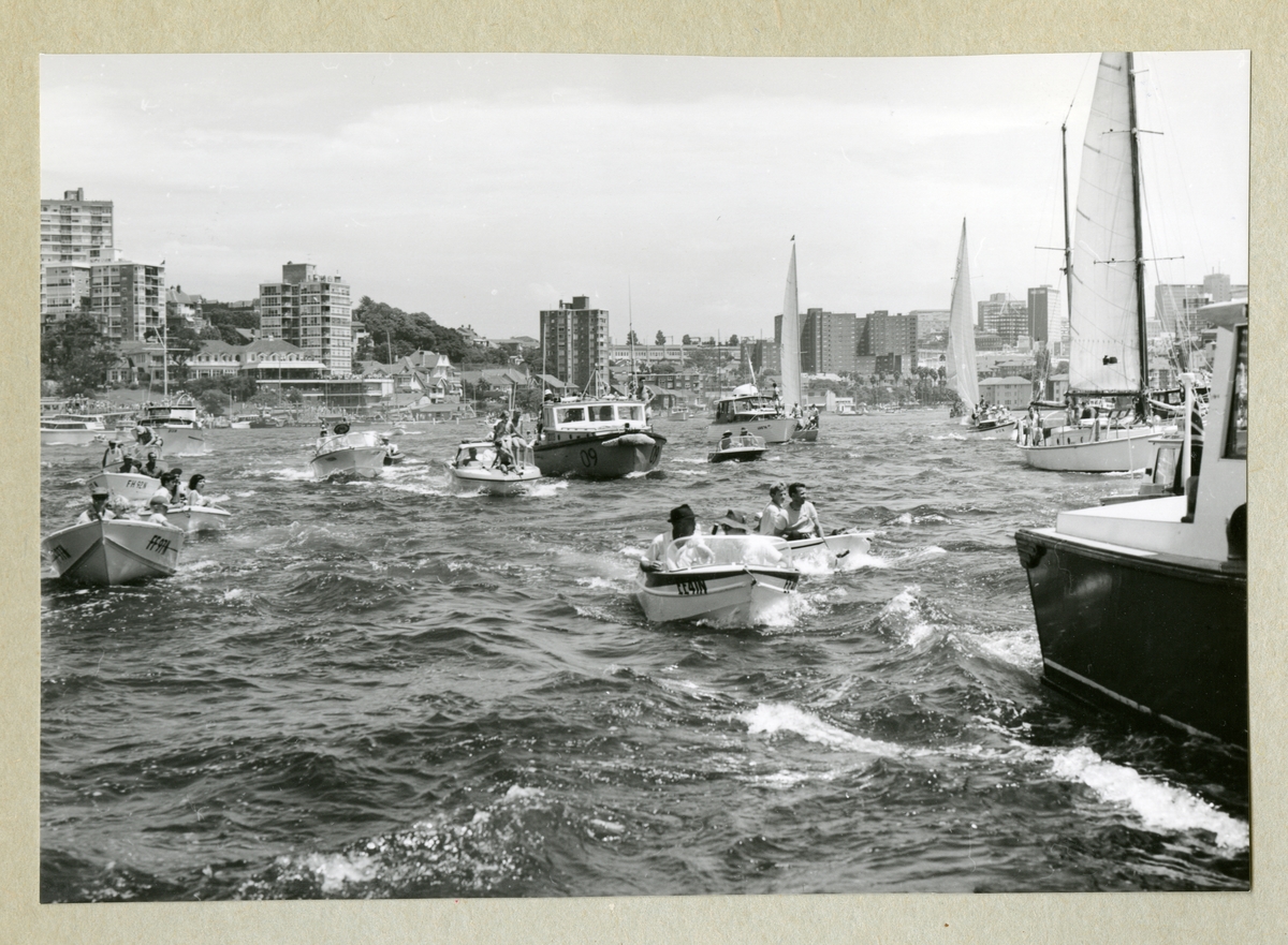 Bilden föreställer en samling av motor- och segelbåtar av olika storlekar. I bakgrunden syns kanten av en kuststad med höghus längs med kustlinjen. Bilden är tagen under minfartyget Älvsnabbens långresa 1966-1967.
