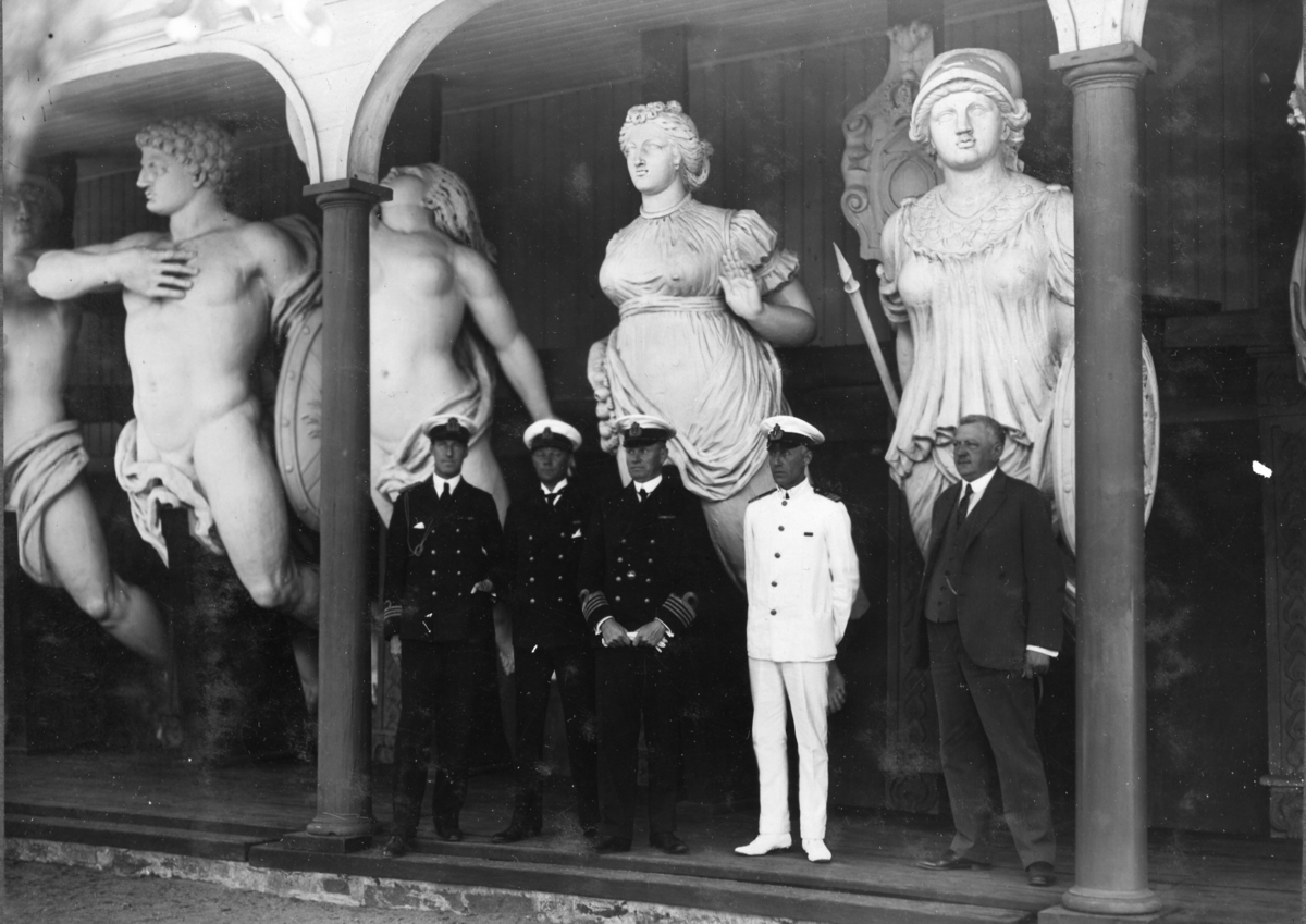 Museinämnden samlad framför galjonsbilderna i galjonsträdgården från vänster kapten Granström, kommedör Wester mariningenjör Halldin och kontrollant Nilsson.