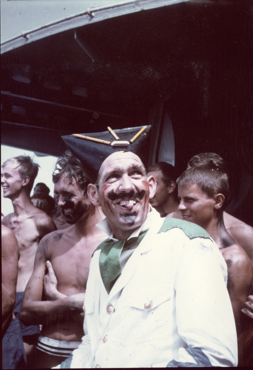 Bilden föreställer Oskar Linde utklädd till kung Neptuns sekreterare under ett linjedop ombord på minfartyget Älvsnabben. I bakgrunden syns barbröstade besättningsmedlemmar med sot på kropparna som deltar i dopet. Bilden är tagen i samband med fartygets långresa 1966-1967.