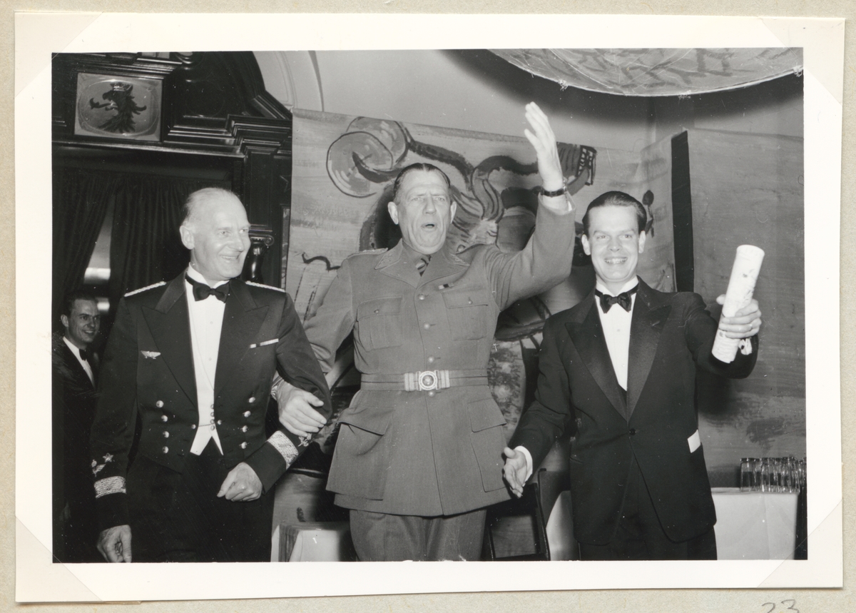 Titel: Rikets överbefälhavare tog aktiv del under "Cabaret Hajstim" och bidrog hörbarligen till underhållningen, 1954-12-11