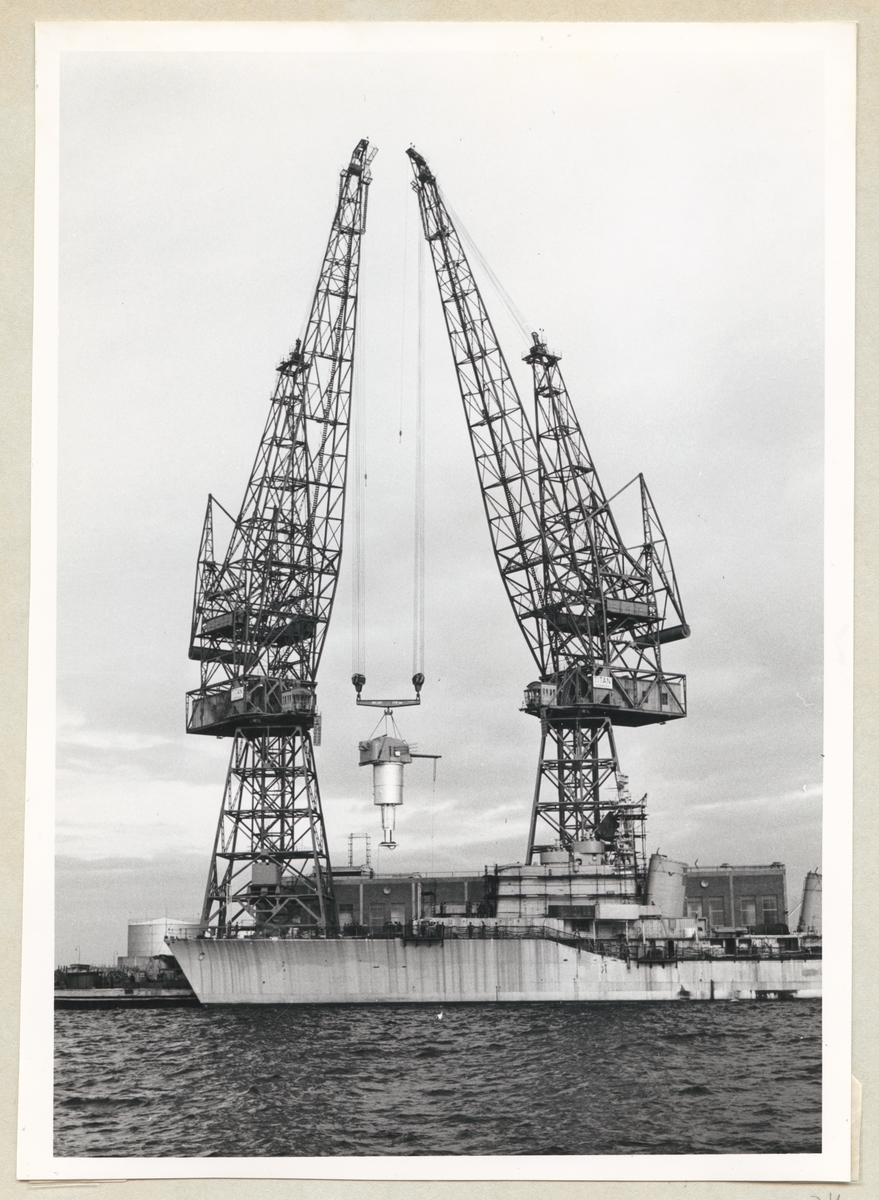 För den colombianska jagaren 20. de Julio byggdes en kanonverkstad, i vilken kanontornen kunde helt färdigmonteras. Ett av de färdiga tornen sättes ombord. 1957-10-02