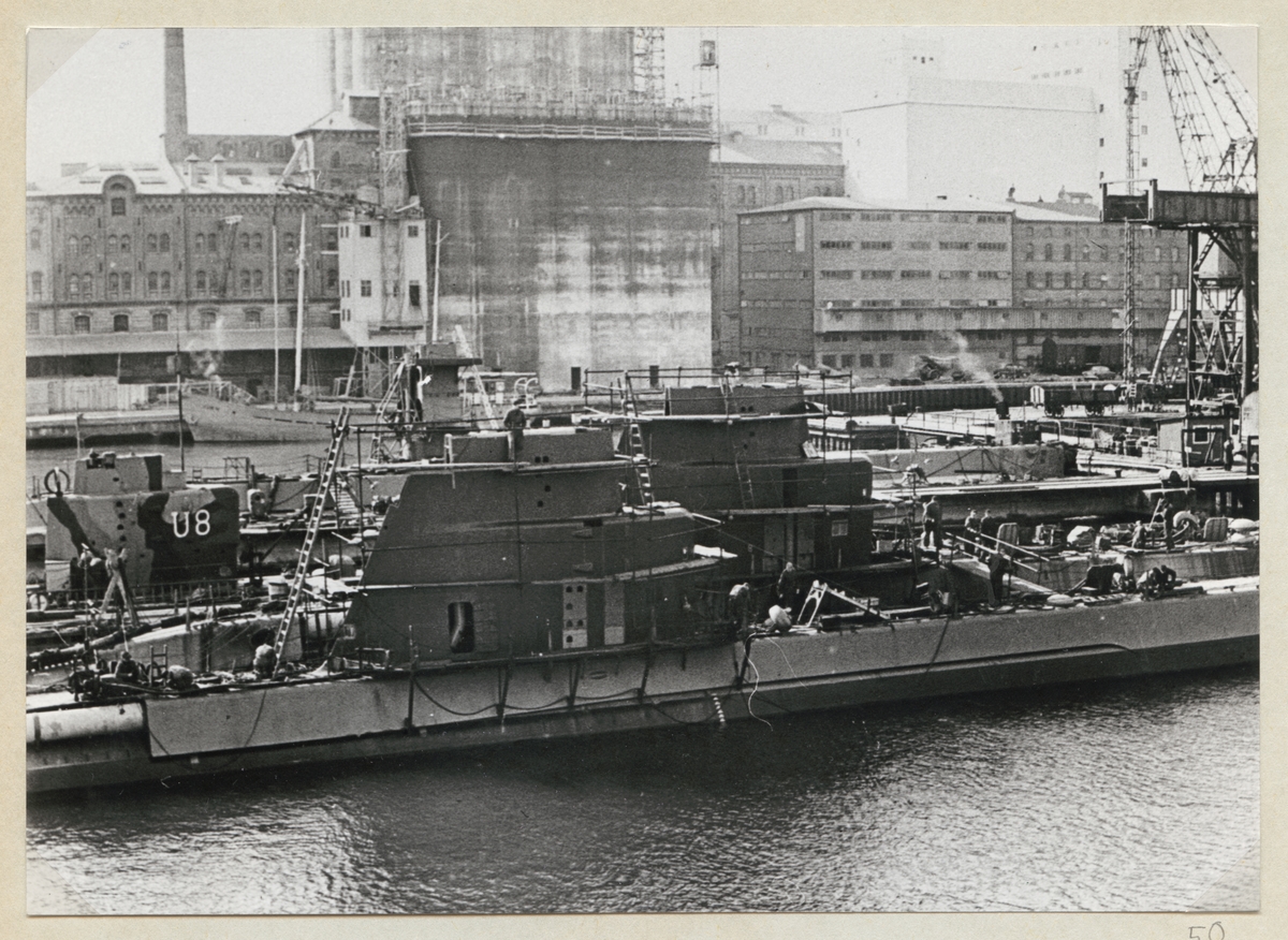 En imponerande utbåtsflotta vid slipbroarna-Draken. Vargen och Nordkaparen under utrustning,samt U8 för studium inför Abborrenombyggnaden, april 1961