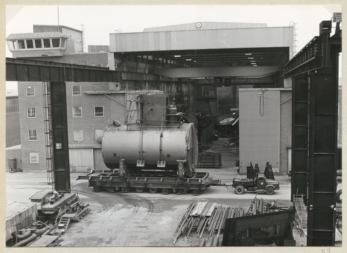 Med Sjöormen-typen började en ny epok, som bl.a. kännetecknas av långt driven sektionsbyggnad och utrustning i sektionerna på land före sjösättning. Manöverrumssektion på trailer framför utrustningsverkstaden, vari insättning sker. 1966-11-19