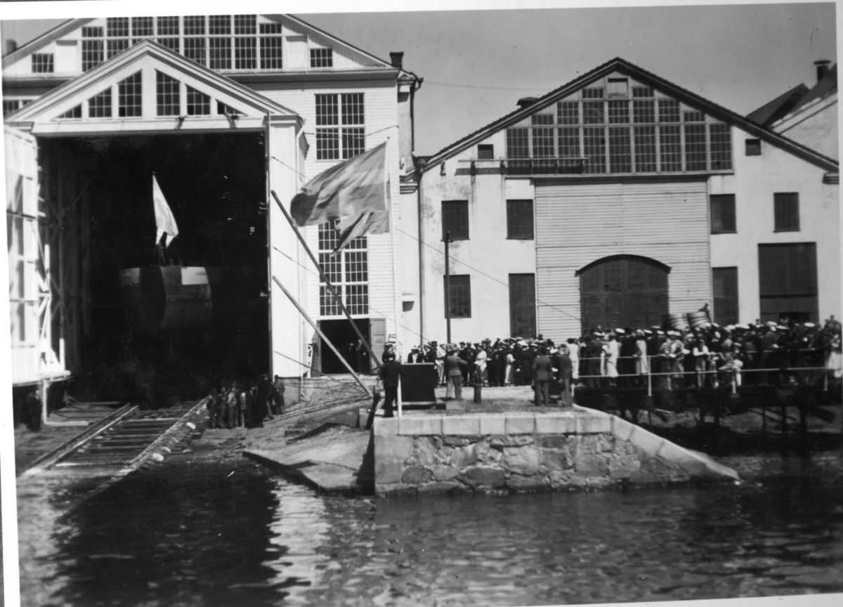 Jagaren KARLSKRONAs sjösättning. Bilden visar jagaren inne i verkstaden strax före avlöpningen.