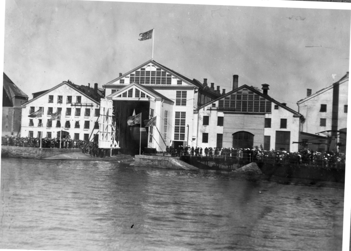 Jagaren KARLSKRONAs sjösättning. Bilden visar jagaren inne i verkstaden strax före avlöpningen.